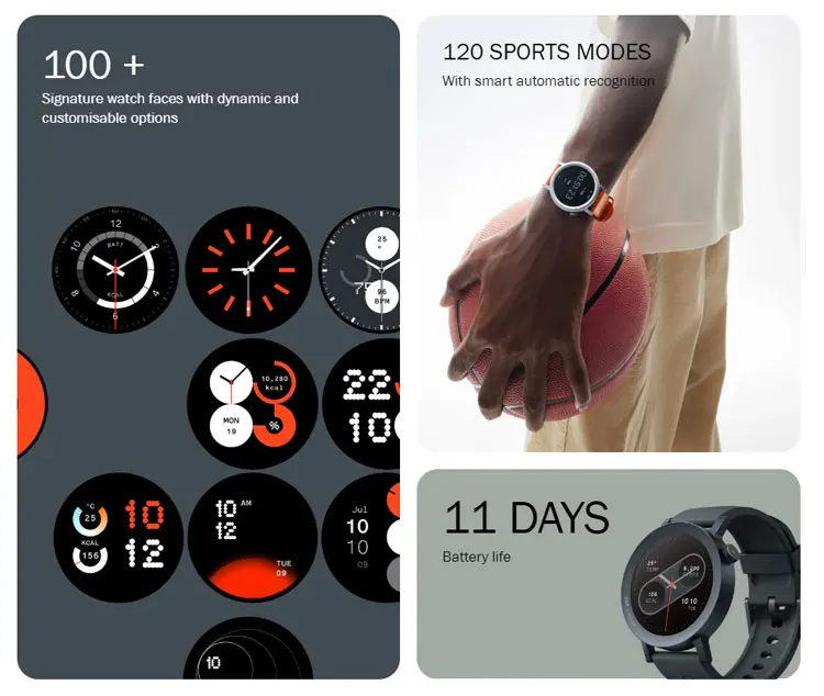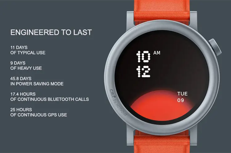 | Design | Interchangeable bezels Colour range: Dark Grey, Ash Grey, Blue, Orange Material: Dark Grey & Ash Grey: Metal body + Liquid silicon strap Blue & Orange: Metal body + Leather strap Size & weight: Dark Grey & Ash Grey: 25.5 x 4.5 x 1.36 cm, 48.1 g Blue & Orange: 25.5 x 4.5 x 1.39 cm, 44.4 g Watch bezels: Dark Grey Curved Bezel, Dark Grey Flat Bezel, Ash Grey Curved Bezel, Ash Grey Flat Bezel Watch straps: Removable watch straps Buttons: Functional Crown |